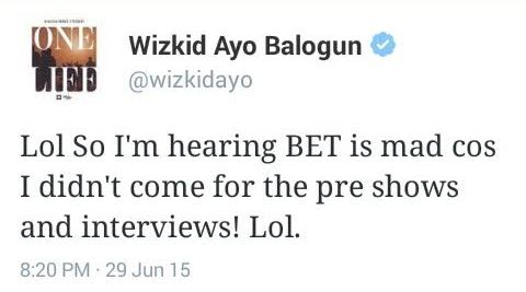 African artistes are voicing out their pains about the BET awards partial arrangement towards African acts .First Fuse ODG, then Yemi Alade, now Wizkid